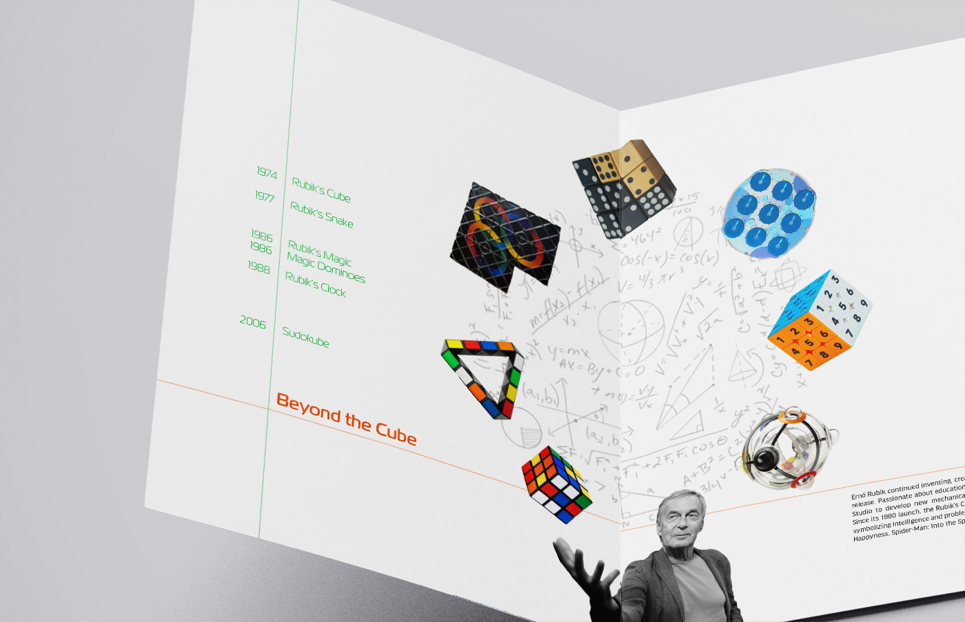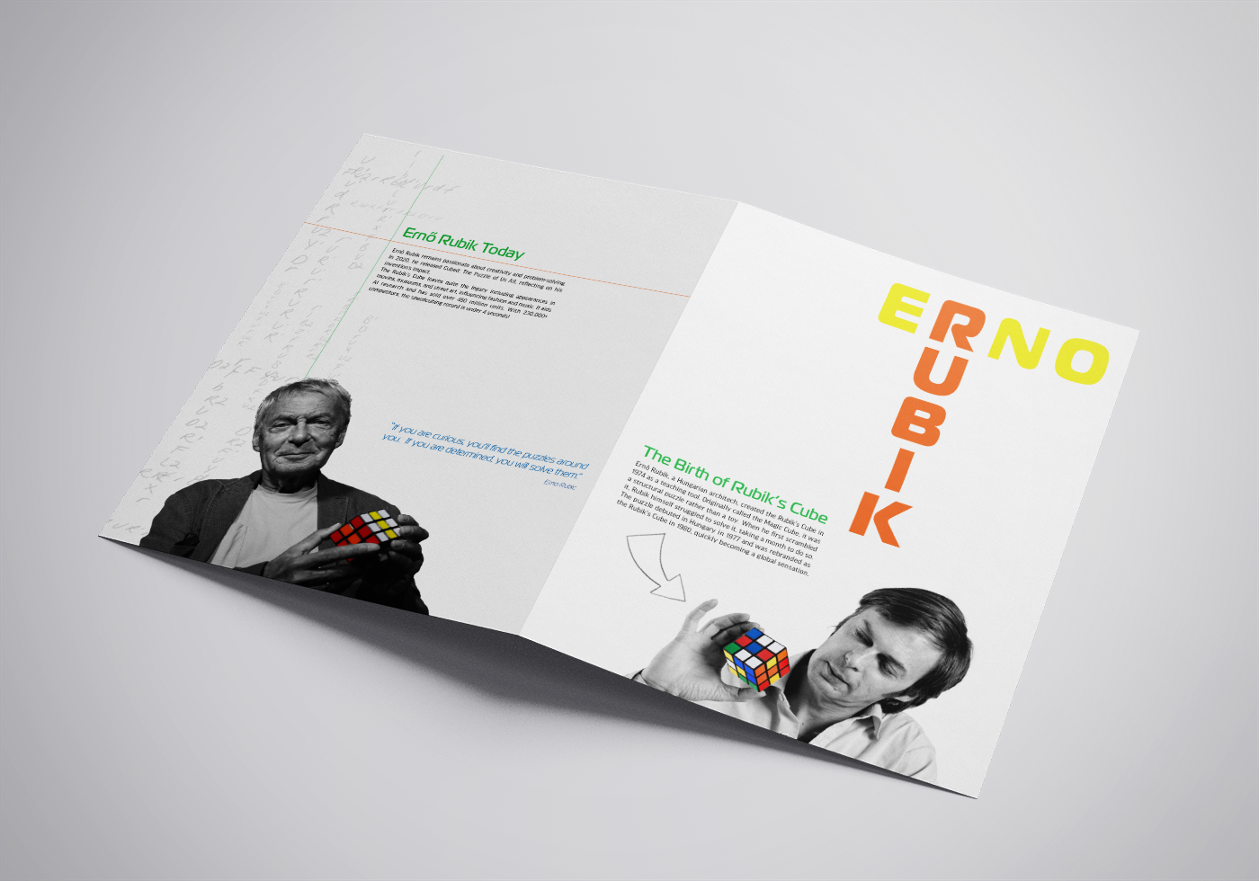 A biography of Ernő Rubik’s professional accomplishments presented as a brief bi-fold. Black-and-white photographs of Rubik contrast with vibrant images of his iconic inventions, highlighting the playful ingenuity behind his creations. A whimsical typeface evokes the puzzle cubes themselves, while a layout attentive to horizontal and vertical lines references the structure of his famous invention, celebrating the enduring legacy of his work.