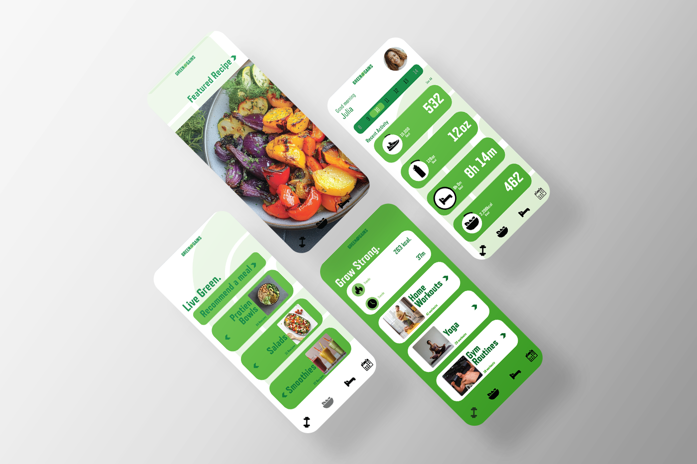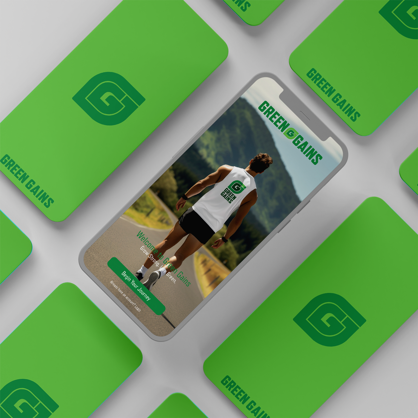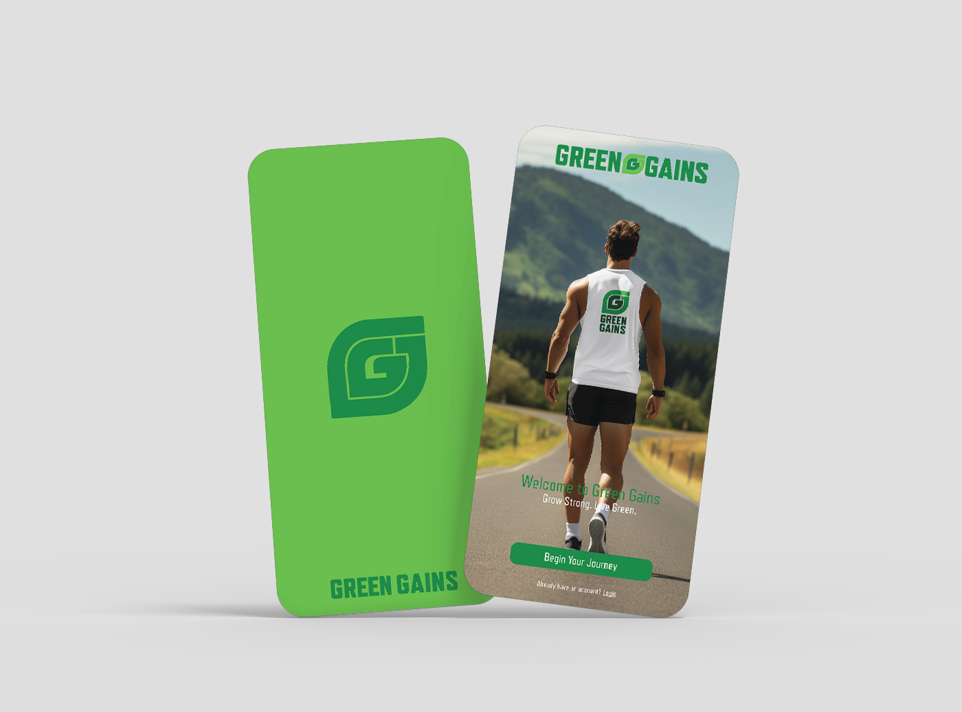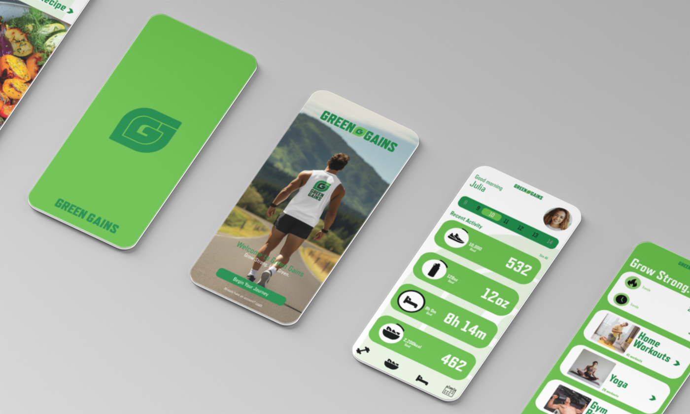 “Green Gains” is a conceptual fitness app that empowers athletes and fitness enthusiasts to build performance and growth through a plant-based diet. The logo combines two interlocking “G”s into a leaf shape, symbolizing vitality and sustainability. A bold, nature-inspired color palette of greens, black, and white reinforces the brand’s focus on health, growth, and eco-conscious living, creating a cohesive and memorable identity.